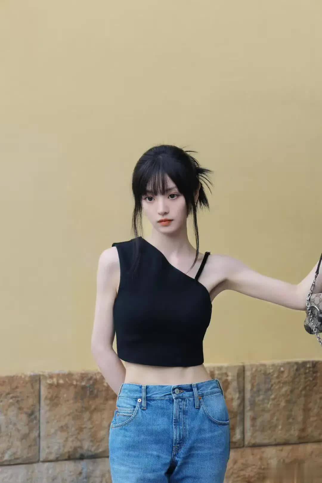 田曦薇身穿的这件吊带衫并不是单单纯色设计,肩部采用不对称的设计,既能展现出潮流感,又能打破吊带衫的单一乏味,露脐短款款式,修身立体的裁剪,勾勒出她的身材曲线,时尚感瞬间别提多高了。