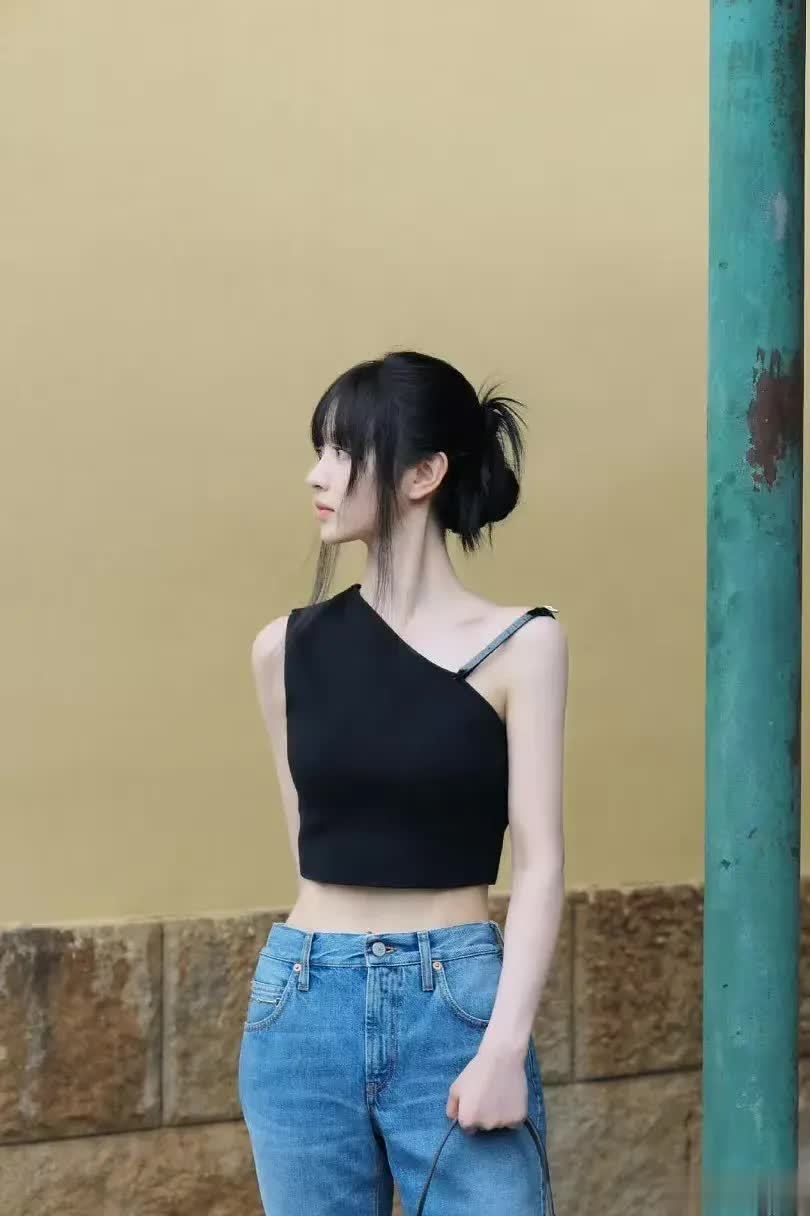 说起吊带衫和牛仔裤的搭配,其实在很早之前就已经开始流行了。而田曦薇作为娱乐圈里的花旦小花,穿上这身不对称吊带衫,配上蓝色牛仔裤,完美诠释了她的个性魅力。